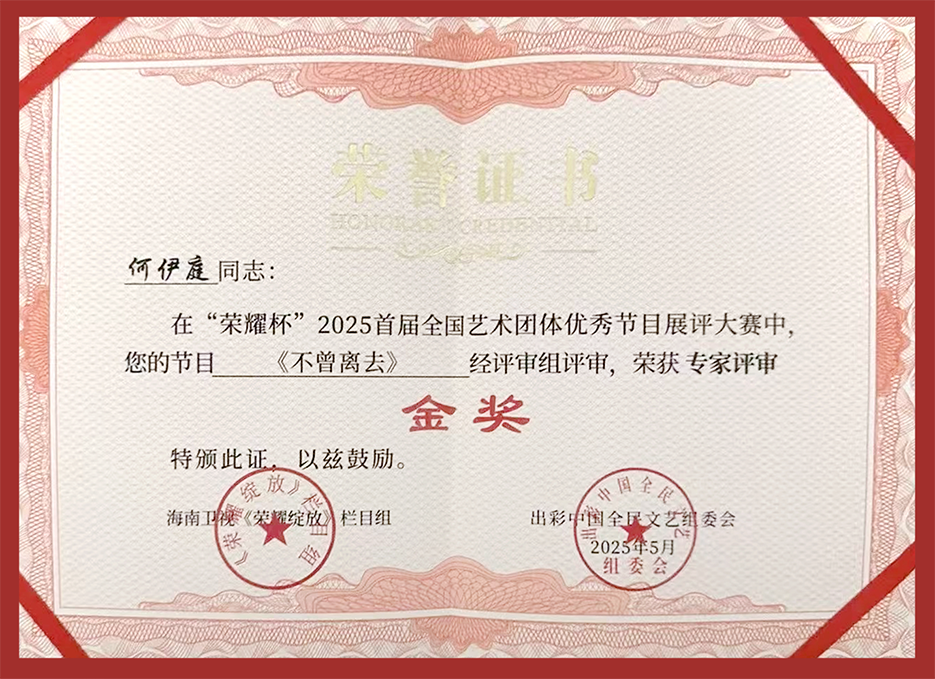 原创歌曲《不曾离去》在“荣耀杯”2025年首届全国艺术团体优秀节目展评大赛中,荣获专家评审金奖和全国荣耀之星银奖;