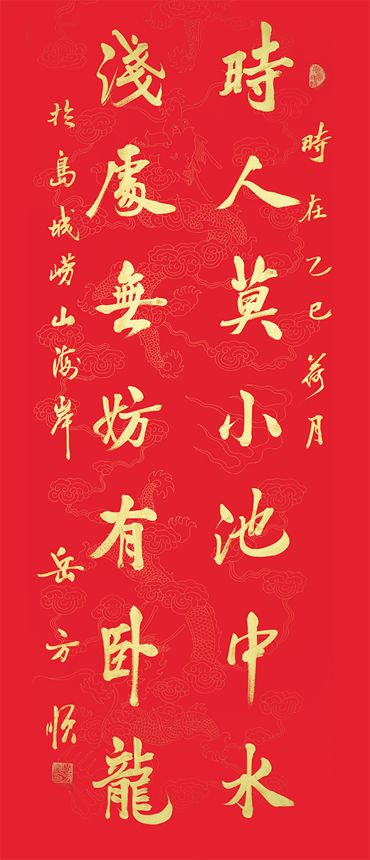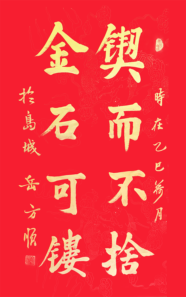 岳方顺,1952年12月生,山东省东营市人,大学学历,系岳飞第三十一代嫡孙。现任中国东方文化研究会副会长,中国齐鲁国学书画研究院副院长、中国人民艺术家协会副会长、中国书法艺术家协会理事、中国榜书艺术研究会艺术委员、中国书法家协会会员、中国楹联协会会员、岳飞思想研究会高级顾问。