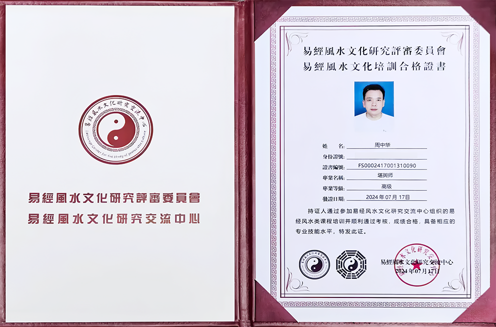 周中华,男,生于1967年8月,重庆市合川人,专业从事堪舆文化与传播三十余年,年少时跟随父亲学习玄学[(堪舆和道法),父亲师承于枯草青师爷(生于明末1643年--仙逝于1991年,但至今仍隐仙于世)]。青年时期,奔走于祖国大江南北,四处拜师学艺,不断汲取各方智慧,后来有幸拜在堪舆界名师匡中行恩师门下,潜心钻研堪舆学(风水学),目前奔走全国各地勤察阴阳二宅风水。
