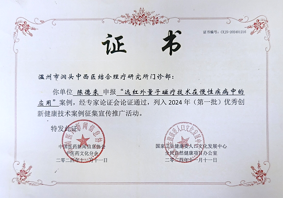 2025年5月1日中国中医药传承与创新网授予陈德来同志“全国中医十佳劳模。1、量子磁棒,滚压人体经络及软组织,能使处于休眠状态的组织细胞活跃后进入血液循环,形成网状细胞籍以增强机体的免疫功能,加强新陈代谢,促进微循环,祛瘀血,并能清除体内致癌和致器官、皮肤老化的自由基以及致疲劳酸痛的尿酸等各有害物质,以达到消除疲劳和健身及预防癌症之目的,健身棒荣获中国第四届专利技术博览会金奖。2、仙手牌生发健脑护眼保心梳,对头皮深层护理,按摩,通络活血,以达到生发护发,保眼保心功能,用远红外磁梳主要是梳通血管和防止硬化,以达到预防中风目的,磁除了刺激头皮经络外还刺激手部眼反射区及劳官穴,以达到预防和生发健脑护眼保心的效果。3、远红外刮痧点穴器。根据现在国家对疫情放开,大家要加强锻炼身体,特别用仙手牌远红外健身按摩量子磁棒,滚背部华佗夹脊穴,能增强免疫力,滚膀胱经能加强五脏六腑的新陈代谢,强壮五脏六腑功能,万一有病毒感染了,症状也会减轻并且由于免疫力增强,也能及时排出病毒,能使病毒阻挡在上呼吸道,经过几天时间抵抗病毒后,症状就慢慢减轻,最后使之转阴。在 30 余年的临床医学实践中,他潜心于中医理疗,不断学习,提高医学技能,热情为广大患者服务。他热心公益事业,多次将自己研发的健身按摩磁棒赠送给敬老院的老人们使用,并开展免费诊疗服务,受到了一致赞誉。