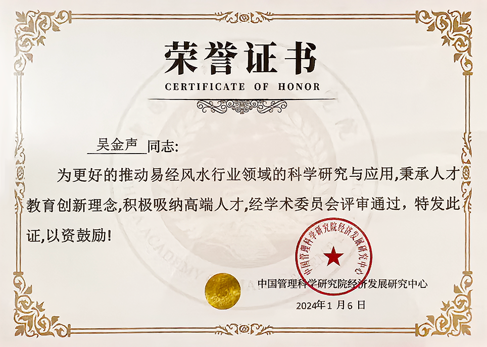 2008年,吴金声被评为国际易学风水大师,全球最具影响力易学风水名师,中国十大风水策划师,公司荣获中国十大易学研究机构等荣誉称号。