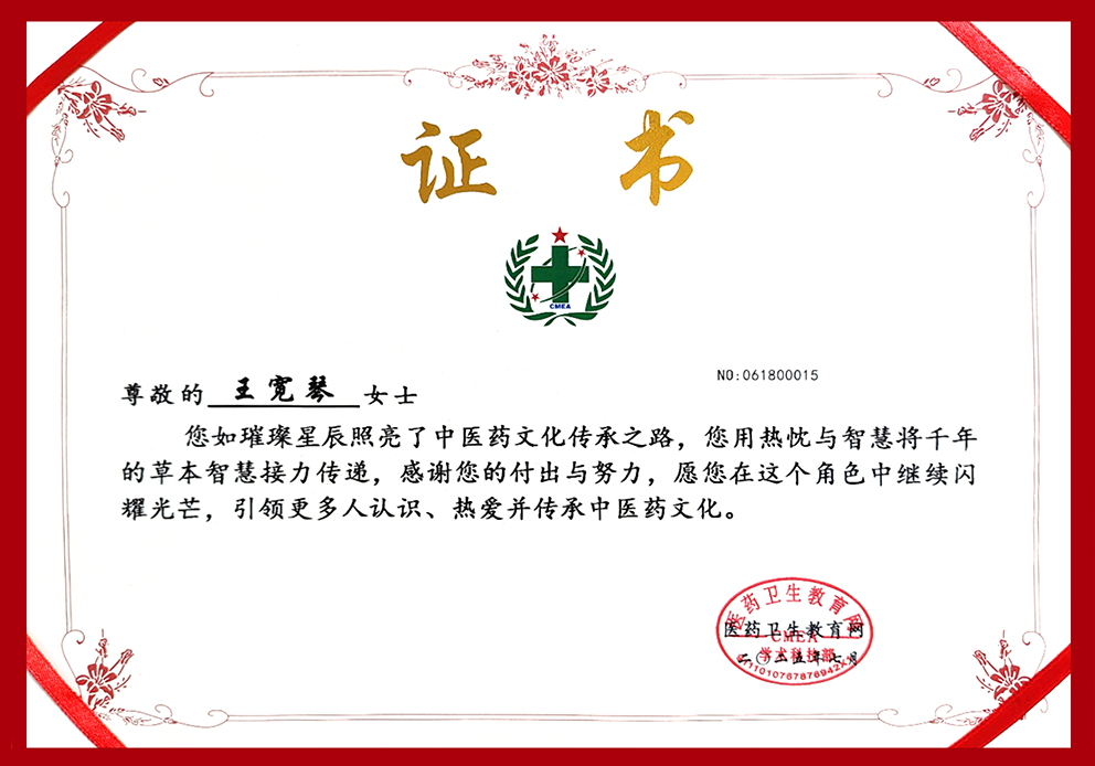 王宽琴的中医之路,始于血脉里的传承。其家族三百年悬壶济世,积淀下丰富的临床经验与深厚的医德底蕴。自幼耳濡目染,药香与医典成为她成长的底色。五岁时,她便随父研读《伤寒论》《金匮要略》,记方识药如数家珍,祖父捻药称量的指尖藏着对医道的敬畏,父亲深夜研读的身影刻着对传承的坚守,“中医之髓,在天地之道与生命哲学”的祖训,早已融入她的血脉,成为她日后悬壶济世的精神坐标。这份自幼浸润的中医启蒙,为她种下了守护生命的初心种子,祖父为照顾老祖母放弃外发展机会的孝行,更让她早早懂得“医者仁心”不仅是技艺的追求,更是对生命最本真的敬畏-医者,当以仁心济世,以道心承术