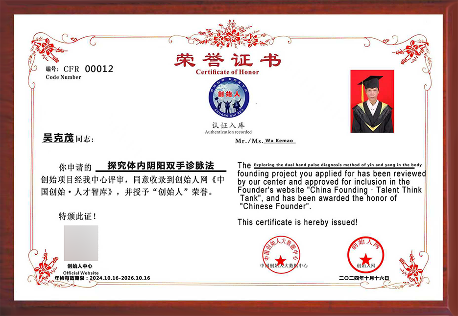 吴克茂大师,1965 年生于广东潮州大吴村,后拜师中南海保健专家胡维勤教授。他是《黄帝内经》古法中医非遗传承人。他扎根经典,更在实践中守正创新,“探究体内阴阳双手诊脉法”创始人,双手诊脉昔在秦汉时期扁鹊三兄弟会这种诊法,由于历史战乱纷争,佚亡......等原因,相当于遗失几千年的枝艺又重新复活,造福人类文明……于疑难重症领域独树一帜,以精湛医术与仁者之心,帮助众多患者重拾生命希望。