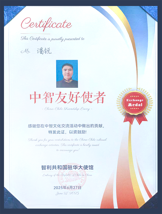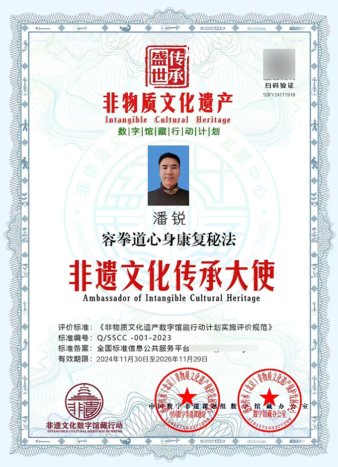 在文化传承与创新发展的道路上,潘锐导师始终步履坚定、成果丰硕。2024 年,他牵头推动容拳道与中南大学、西安交通大学共建“产学研合作基地”,2025 年 11 月,潘锐导师与重庆大学携手聚力“容拳道教学实践与数字化传承”项目方案,实现传统健康智慧与现代科学技术的深度融合,为容拳道的可持续发展奠定坚实基础;同年,获评“容拳道心身康复秘法非遗文化传承大使”,正式肩负起守护、传承与传播非遗文化的重要使命。2025 年,潘锐导师受邀走进多国驻华使馆传授容拳道健康智慧,受聘为克罗地亚第三任总统伊沃·约西波维奇特邀容拳道顾问,先后荣获“中国阿盟友好交流使者”“中智友好使者”等荣誉称号,受聘为多国外交机构容拳道心身健康顾问,更获 CCTV《为爱助力》栏目授予“爱心慈善大使”。一系列国际交流成果的落地,不仅让源于中国的容拳道智慧成功跨越国界、走向世界,更搭建起中外健康文化交流的重要桥梁,为推动全球健康文化多元融合、构建人类卫生健康共同体贡献了中国力量。
