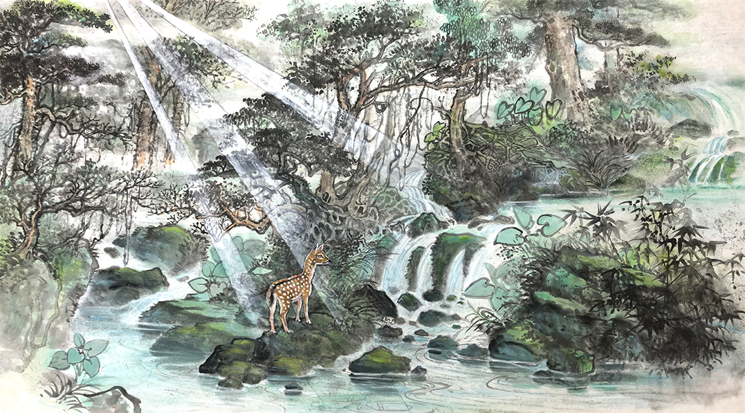 作品:《晨光》;规格:高0.59m x 长1.06m。丰富的艺术和文化内涵,国画与油画融合光影技法的创新风格。冬季的清晨,缕缕阳光映照着山谷里的松柏草木藤蔓,微微的寒风吹送着山岚和松子的清香,不远处的溪涧传来了潺潺流水声,与鸟声和鸣,清幽静谧,灵气流动。松树旁边,一只小梅花鹿东张西望,惊恐不安,像是刚刚躲过掠食者的追赶。小梅花鹿生长在弱肉强食的丛林里,离开了自己的父母,它就是老虎狮子们的美食。因此,小梅花鹿要学会求生技能,才能在恶劣的环境中生存成长。这是画中的话。
