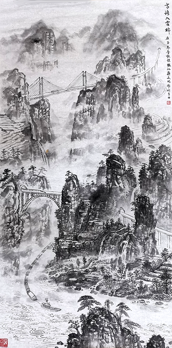 构图难度高而复杂,藉数十年的创作经验和丰富想象力,把握重点突出中心。创作中画稿一气呵成,画作采用国学S型风水构图设计,高低纵横错落有致,使画面安排合理自然,生动有神韵。首尾呼应,虚中有实,实中有虚,虚实相生,生生不息;动中帶静,静中带动;干中有湿,湿中有干;黑中显白,白中显黑,有透视光感。白云飘飘,风声呼呼,气流涌动。交通连贯四海,嘉宾来自五洲。天上飞机,陆地高铁高速,虎门吊索大桥,深中大桥,顺德大桥,高楼大厦栉次鳞比……画面景物珠联璧合,融为一体。祖国建设发展日新月异,大湾区生机勃勃。《腾飞大湾区》也就是腾飞的中国!