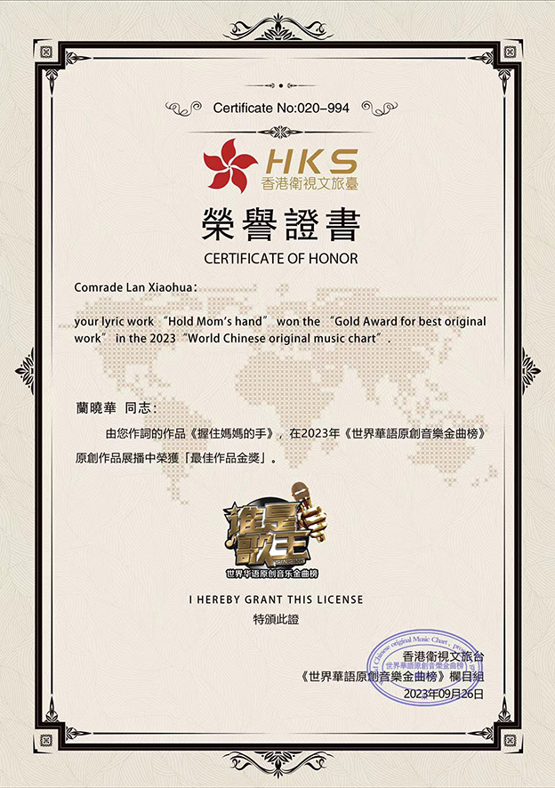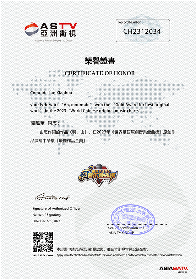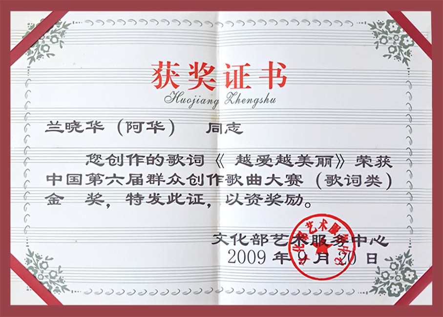 词作者兰晓华(笔名:阿华)目前是中国音乐文学学会会员、中国音乐著作权协会会员、桂林市音乐家协会会员、南宁市音乐家协会会员和广西音乐家协会会员。