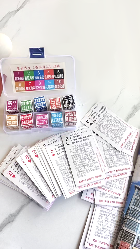 3、学习设计魔法写作牌,把素材的归类和知识的分类做好,并把技法、教法、学法、范例都印制成卡片和扑克牌,像打牌一样快速作文。
