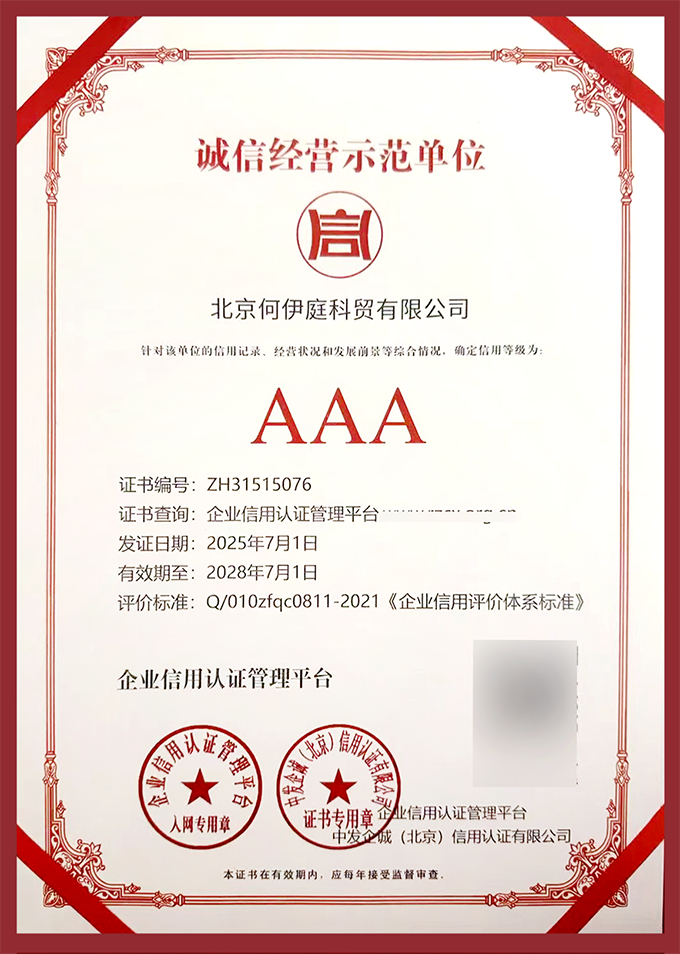 北京何伊庭科贸有限公司荣获诚信经营示范单位,确定信用等级为AAA。