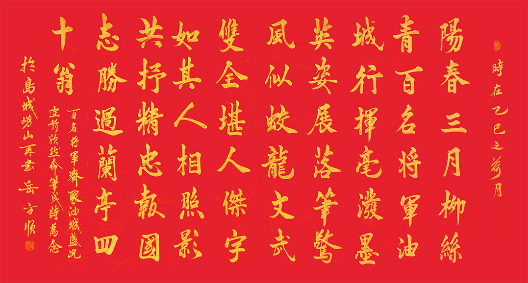 为河南汤阴县岳王庙题写下了“三代祠”的匾额。为《走进中国艺术大师》一书提名,多幅作品被《走进中国艺术大师》、《中国当代艺术名家》两书吸收选用。书法作品,还先后赠送了国民党名誉主席吴伯雄先生、国民党主席马英九先生以及国民党的老将军岳天先生。还给中国人民解放军诸多的老将军赠送了书法作品。同时,还把许多书法作品赠送给社会各界朋友,收到将军们和众多朋友的广泛赞誉。作品先后在《人民日报》、《中华盛世》、《中国文化报》、《中国书画报》、《民生周刊》等杂志正版刊登。先后被中央电视台、“新华网”华人会客厅、山东电视台“天下收藏”频道等采访。书写的毛主席《沁园春·雪》长卷被人民大会堂收藏。