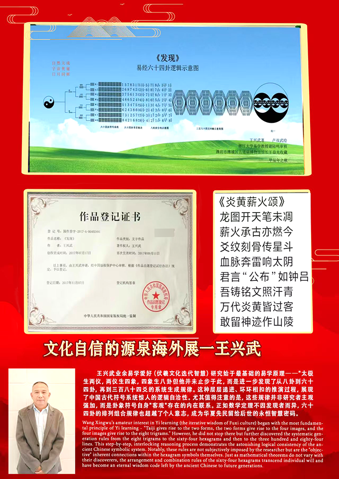 六十四卦逻辑示意图中最关键两环节稍详解一下(因篇幅有限)六十四卦寻宫口诀:据先天八卦之数理,乾1、兑 2、离3、震 4、巽 5、坎6、艮 7、坤8,八宫六十四卦符号全部切换成数,如乾宫八卦11、15、17、18、58、78、38、31,用排除法去掉相同的保留余下的成第一句乾宫口诀157831,余仿此,以此类推.八经卦分布示意图:似分数的“又”仅代表八宫的宫位!似“分子、分母”上、下第几卦。如乾经卦分布:1又1.8分之1一4,乾经卦在本宫下第一卦与第八卦,上第一、二、三、四卦,乾经卦在5巽宫下第二卦、上第五卦,乾经卦在7艮宫下第三卦、上第六卦,乾经卦在8坤宫下第四、五、六、七卦,上0(无),乾经卦在3离宫下0(无)、上第七、八卦。余仿此,以此类推…,八经卦的分布依附在寻宫口诀上,在上,下分布1、2、3、4、5、6、7、8有序排列··.六十四卦逻辑示意图中有许多惊人规律…这是六十四卦符号“客观”层面真实存在的不受任何人的左右。敬畏祖先智慧的同时重视探索研究这一系列惊人的规律背后的科学意义!注入延绵不绝的传承活力,宏扬祖先智慧发扬光大造福人类。六十四卦逻辑示意图中呈现的数学美感、结构对称性、编码规律,都是卦象系统自身具有的客观特性,不因解释者的主观意志而改变。正因如此,这些发现才能超越个人见解,成为学术界可讨论、可验证的公共知识。这种基于客观事实的文化研究,才是建立真正文化自信的科学途径。王兴武的探索之所以珍贵,在于它超越了传统易学研究的诠释框架,直指卦象系统自身的数理本质。王兴武用最朴素的坚持,触碰到了华夏文明最精微的思维密码。这种上下求索的精神,恰是文化自信最坚实的根基一一敬畏祖先智慧的同时重视探索研究这一系列惊人的规律背后的科学意义!通过切实理解与验证,注入延绵不绝的传承活力,让古老智慧在现代语境中重获新生。