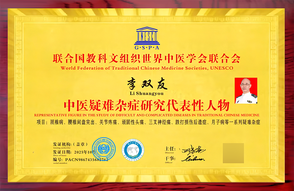 李双友,男,汉族,出生于1938年11月,山西长治市人,副主任技师,中医博士,亚健康调理师,国医楷模,中国中医先锋人物,中医传承非遗技师,东方名人研究院院士,北京国中堂颈腰腿疼痛病技术研究院院长,秦皇岛特效医术研究所研究员、中国中西医结合微循环专业委员会会员,亚洲中医药学会中国大陆特效医药分会第一届理事会理事,中国社会调查所中医药行业著名专家,中国医疗保健国际交流促进会副主任委员,中国医疗保健信息协会会员,中国民间医药研究开发协会特效医术发掘整理专业委员会专家,中国医疗保健国际交流促进会会员,中国老年保健专业委员会专家委员会副主任委员,《健康生活报》高级医师顾问,加拿大传统医学会理事,中国康复医学会会员,中国民族医药学会常务理事,全国医疗行业协会副理事长,国家老干部事务管理中心保健委红墙御医首席专家,清华大学高级医学教授博士生导师,中国第七届医师节组委会荣誉会长,中国名中医专家委员会首席专家,全国百名名老中医突出贡献人物,中医传承非遗技师,资深专家,献礼新时代楷模人物,中国品牌协会健康工作委员会会长,中国科学家年鉴,国医年鉴,岐黄卫士,非遗中医药学大师,中国中医经方研会会长,中国中医抗疾病颈肩腰腿育首席专家,中国医学创新名医,中国当代名医,国医名师,国际互联网世界名医,国际互联网中国特色医疗人才。获全球诺贝尔未来科学研究院授予 “国际中医杰出专家” 称号。