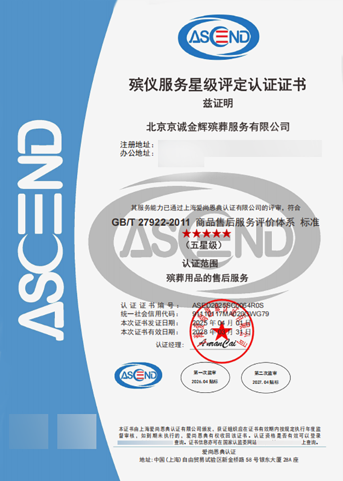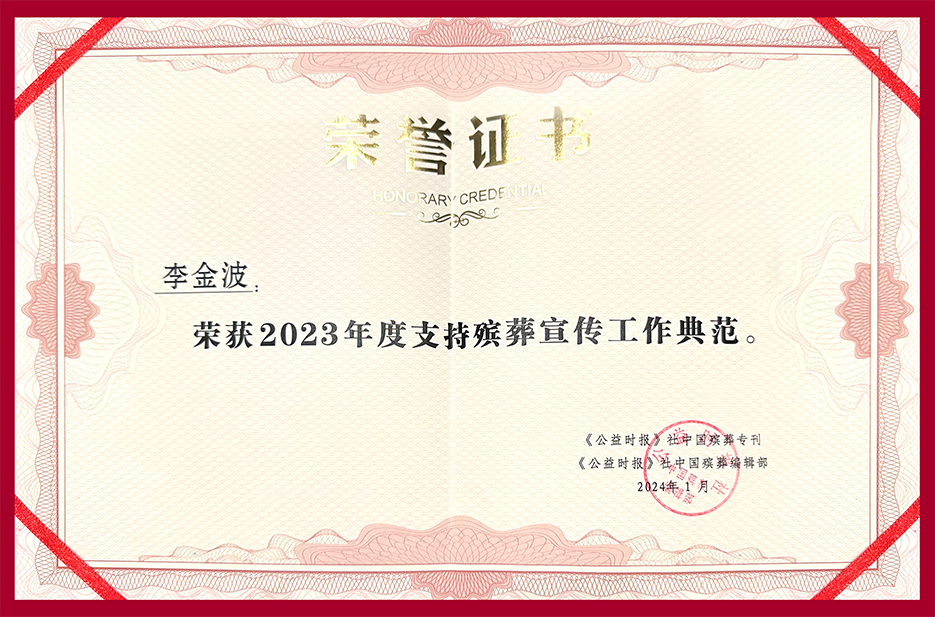 公司是北京市质量信誉承诺企业、北京市殡葬协会会员、社会企业质量协会会员,已通过殡葬服务星级评定五星级认证、职业健康安全管理体系认证、环境管理体系认证、质量管理体系认证。