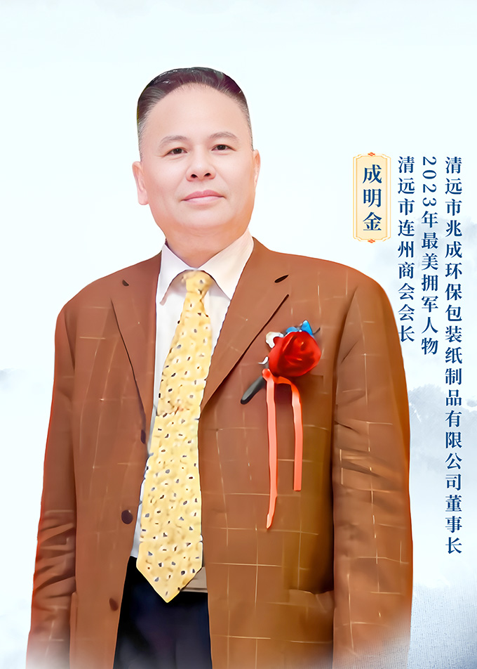 成明金,男,汉族,1963年8月出生,中共党员,大专学历,广东连州人。1981年参加工作,1985年退役后返乡,1986年初在广州市无线电厂工作了一段时间,在部队服役期间所学的专业特长就是无线电,1990年开始创办一间加工厂,宏业玻璃纸经营部,1997年独立自主创办制造业工厂,广州市天河东棠兆成纸浆模塑制品厂,至今经营,2006年初经清远市政府招商引进在高新技术开发区创办一间制造业公司,清远市兆成环保包装纸制品有限公司。(现任董事长)2023年被评为:2023年最美拥军人物。